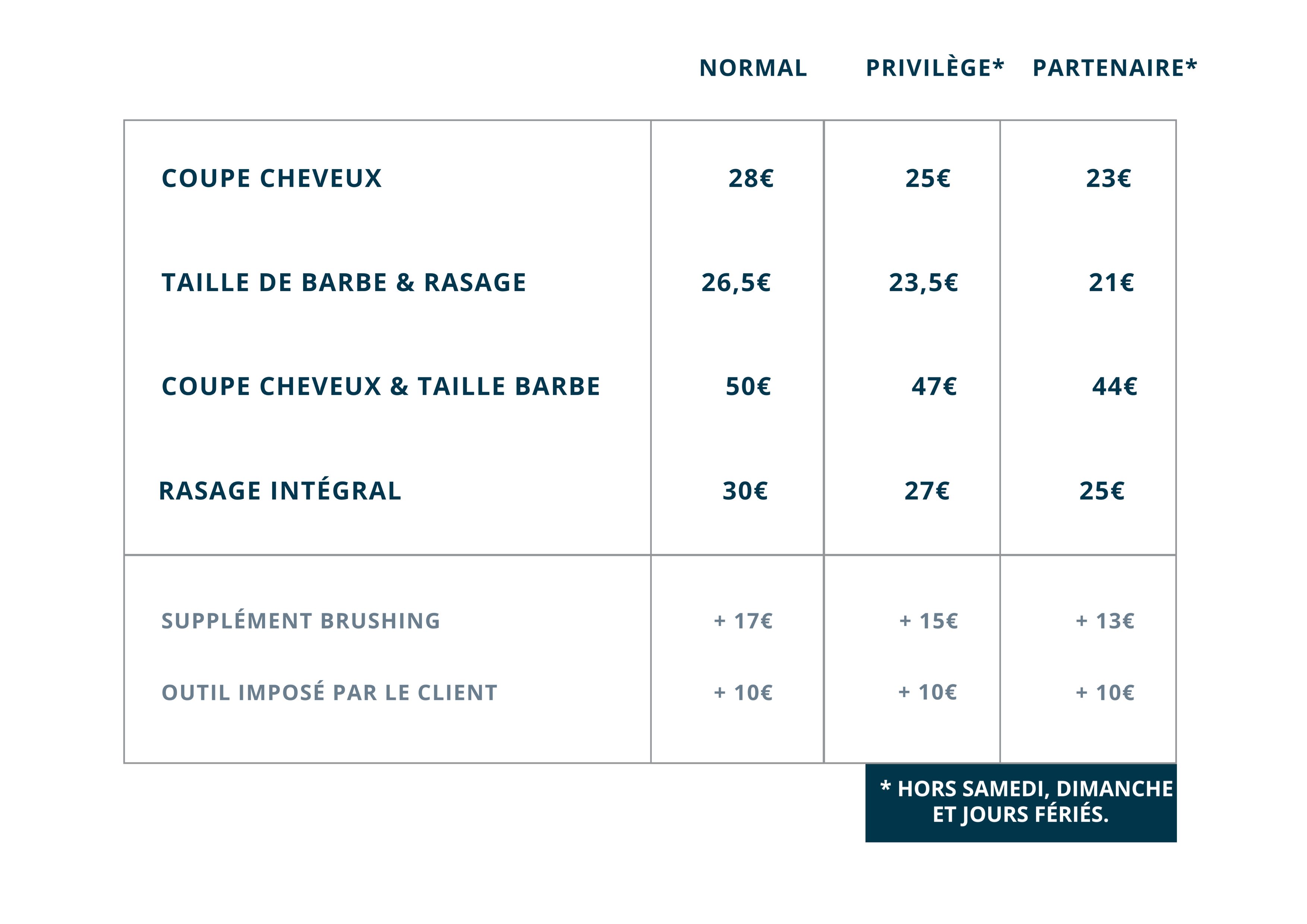 Services proposés : coupe de cheveux, taille de barbe, rasage traditionnel, soins capillaires et entretien de la barbe.